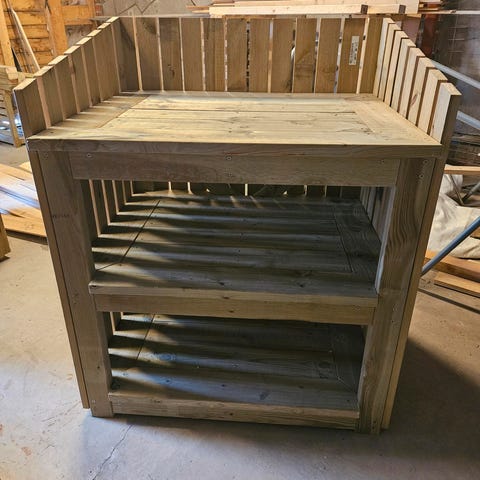 Potetbinge laget av tre med integrert rist i bunnen for lufting. Solid og tung sak av eldre flott treverk. Ca mål 80-100cm høy og rundt 70 bred, mer nøyaktige mål kan skaffes.