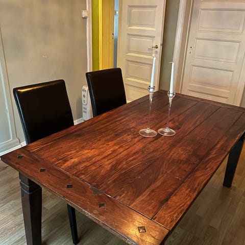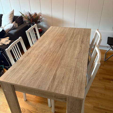 Gir bort solid spisebord med innleggsplate, grunnet flytting.Total lengde med plate 2 m. Uten plate: 140 m. Kjøpt på Ikea.