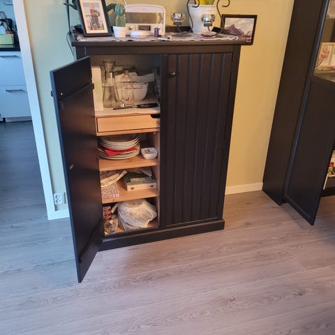 Svart malt kommode. Brukes i gangen i dag til votter, luer osv. Mange fine muligheter med denne :)