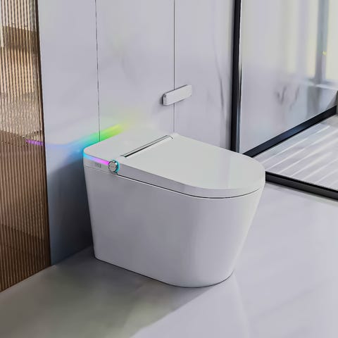 F5 smart toalett gir en moderne premium-opplevelse med automatisk åpning, instant oppvarmet vann, dyse-sterilisering og eksklusivt dekorlys – perfekt for et smart, hygienisk og stilrent baderom.