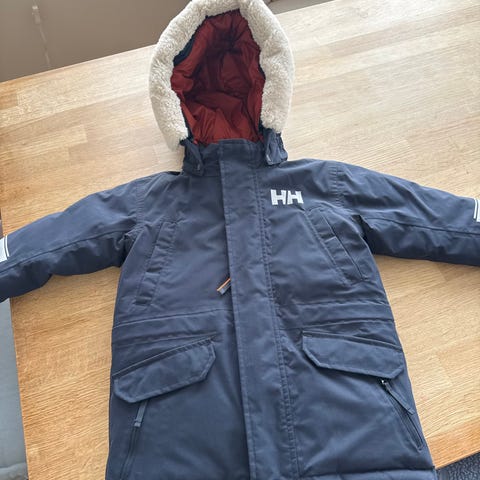 Helly Hansen dunjakke ( 60% andedun 40% andefjær) med hette i størrelse 128, farge blå. Pelskanten på hetten kan taes av. Jakken er vannavstøtende og veldig god og varm. Kan strammes inn i livet. Borrelås for justering nederst på ermene.