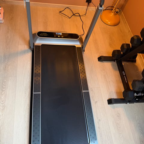 Selger en Gymstick WalkingPad, en elegant og plassbesparende gåmølle av høy kvalitet – perfekt for hjemmetrening eller bruk under hev-/senkepult på kontor.