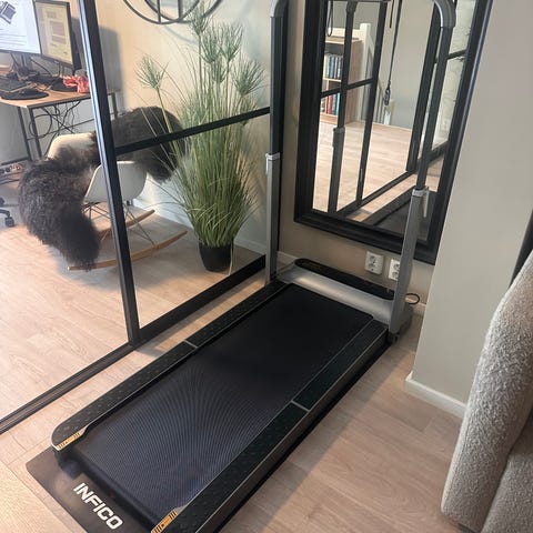 Dette er en premium walking pad med stillegående motor, smart design og app-tilkobling via Bluetooth, slik at du enkelt kan følge økter, distanse og progresjon på mobilen. Når den ikke er i bruk, foldes den sammen og skyves enkelt bort under sofa eller seng.