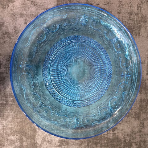 Blå glassfat med blomsterdekor - kakefat