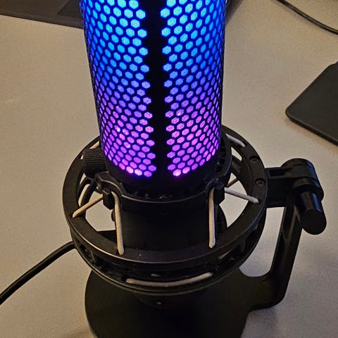 Selger en HyperX QuadCast S USB-mikrofon i svært god stand. Mikrofonen fungerer helt perfekt og gir klar, fyldig og profesjonell lyd, ideell til gaming, streaming, Discord, podcast og møter.