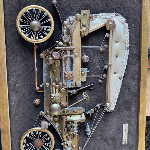 VTG Junk metal ART, 1909 Rolls royce, vintage. Håndlaget, forskjellige junk deler, velur bakrunn. Må hentes.