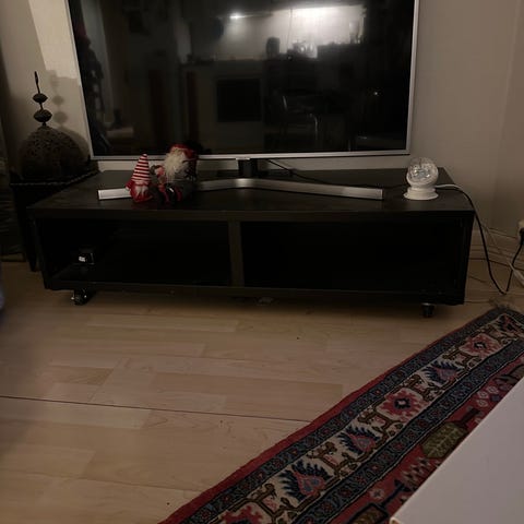 TV benk på hjul, av ukjent merke, gis bort mot henting.