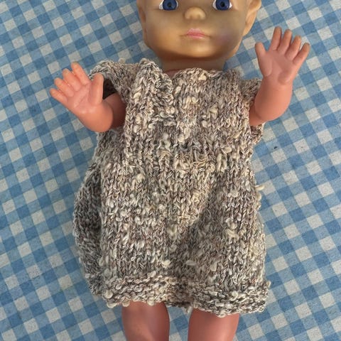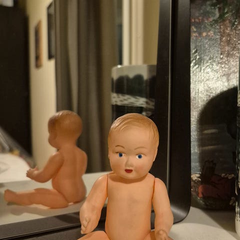 Dukken er en vintage babydukke, sannsynligvis laget av celluloid, kompositt eller vinyl, med bevegelige lemmer.