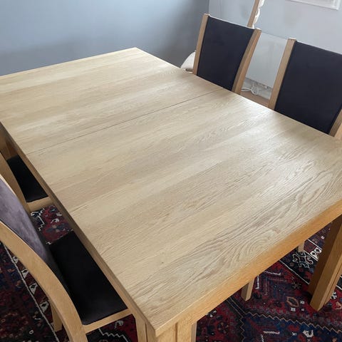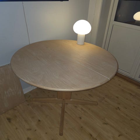 Rundt, svært pent brukt spisebord fra Skovby selges. Heltre naturoljet eik. Diameter 130 cm. Selges med 4 stk 50 cm ileggsplater, som gjør at bordet kan trekkes ut til 330 cm. Nypris (tilbudspris) fra forhandler i dag er 32.000 kr (bord pluss to ekstra innleggsplater).