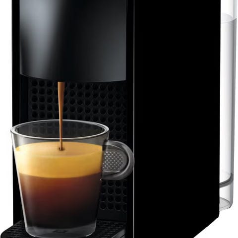 Krups Nespresso Essenza Mini kaffeautomat i svart farge. Kompakt design med vanntank på baksiden. Egnet for enkel tilberedning av espresso og andre kaffetyper ved bruk av Nespresso-kapsler.