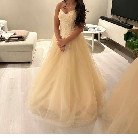 Lyseblå kort ballkjole i størrelse L, men passer også S/M. Kun brukt en gang.