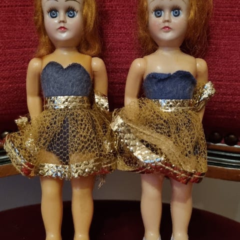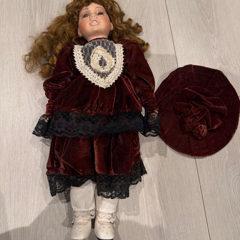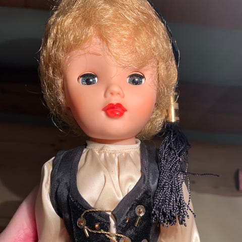 Dukken er ca. 80 cm høy og fremstår i pen stand med pent hår og originale klær (rød kjole med hvit krage og strikkede sokker).