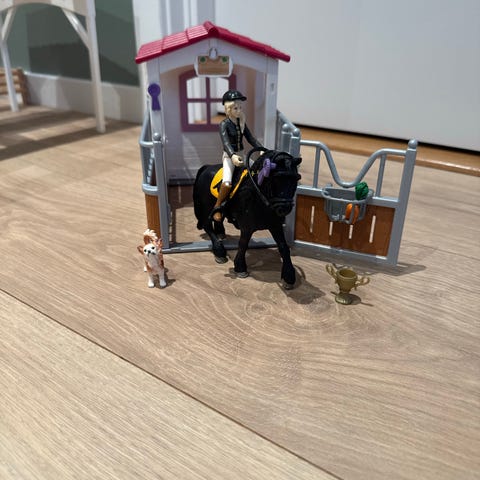 Schleich Horse Club lekesett som inkluderer en hest og ulike tilbehør som møbler og utstyr. Settet er designet for barn og gir mulighet for lek og fantasi rundt hestestell og stallmiljø.