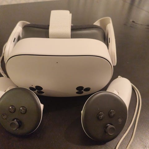 Annet VR-headset med tilhørende kontroller. Produktet er designet for bruk med ulike VR-applikasjoner og spill. Settet inkluderer ett headset og to håndholdte kontroller for interaktiv bruk.