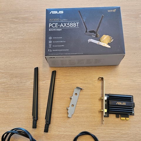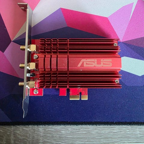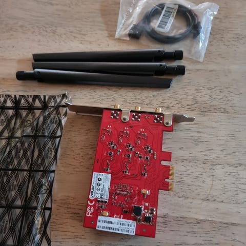 ASUS Annet datakomponent. Ekspansjonskort med PCIe-tilkobling og to antenner. Rød farge med metallisk finish.