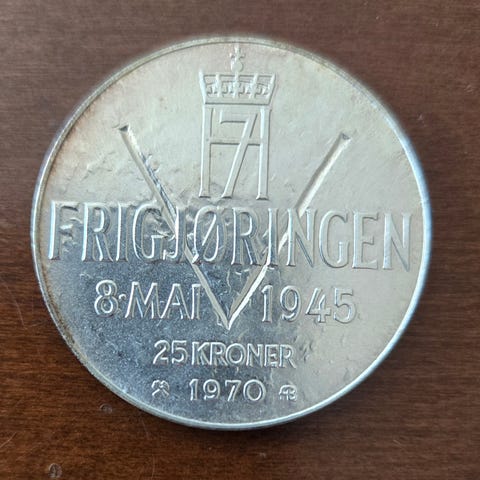 Norsk 25 Kroner mynt fra 1970 med motiv som markerer frigjøringen 8. mai 1945. Mynten har portretter av Håkon VII og Olav V med teksten "Alt for Norge". Bud ønskes. Kjøper betaler frakt. Bud ønskes!