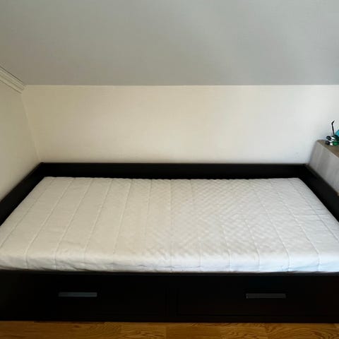 Selger en IKEA BRIMNES dagseng (80×200 cm) med 2 oppbevaringsskuffer og 2 ÅSVANG madrass.