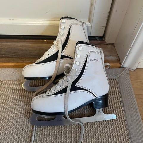 High Andre skøyter i størrelse 38 for barn. Skøytene har svart og hvit farge med snøring og polstret innside for komfort. Egnet for ulike skøyteaktiviteter.