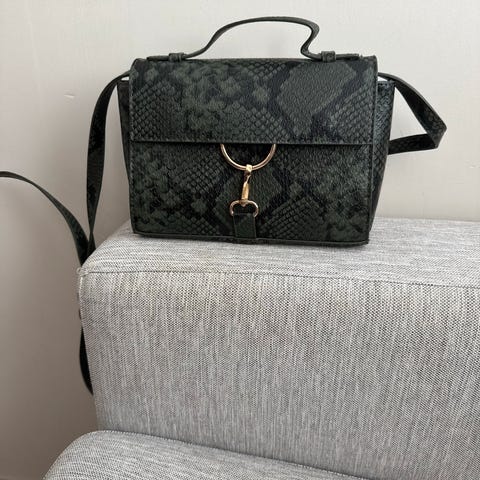 Harrods skulderveske i svart farge. Vesken har en justerbar skulderrem med kjededetaljer og lukking med klaff. Innvendig har den et rom med glidelåslomme. Pen veske som er pent brukt sett fra fremsiden, men vesken har bruksspor på baksiden.