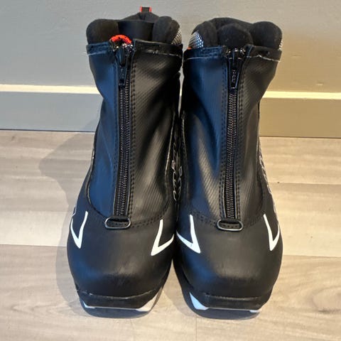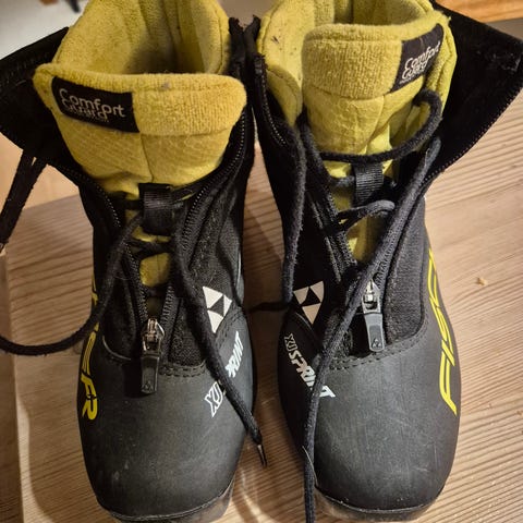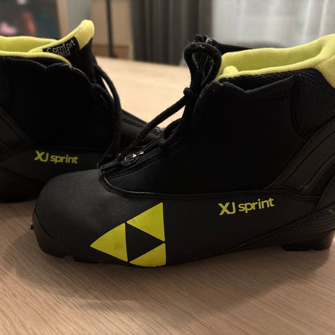 Fischer XJ Sprint langrennssko i svart og gul farge. Skoene er pent brukt av ett barn.