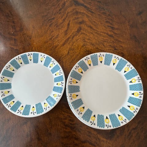 Diverse frokost- og kaketallerkener fra Figgjo, Stavangerflint, Egersund, Rørstrand og Gefle. Pluss en tv-tallerken og et eggeglass