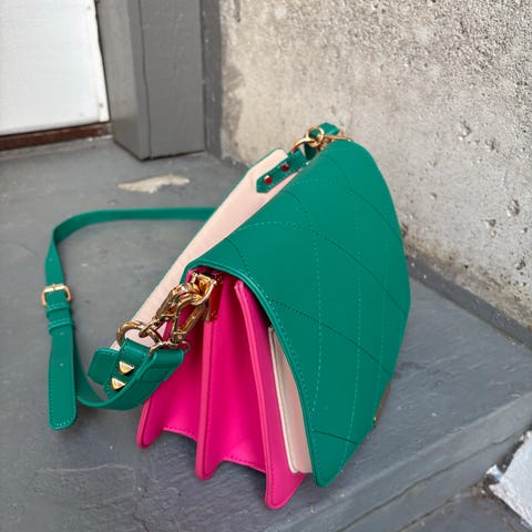 Marc Jacobs veske laget av semsket skinn, designet for dame. Vesken har en avtakbar og justerbar skulderstropp med dekorativ tekst. Den har glidelåslukking og en kompakt rektangulær form.