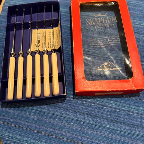 6 stk som heter «Skaugum» ligger i originaleske og 6 stk som heter «Martha» er uten eske :)