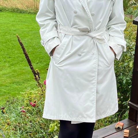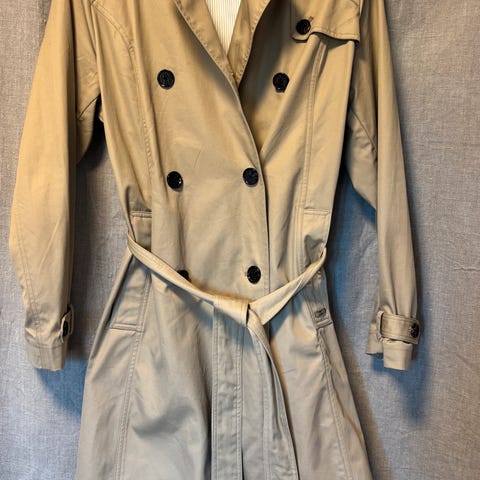 Pent brukt kåpe/trenchcoat fra det Danske merket «Jensen», str. 38, liten glidelås, samt knapper og belte med spenne for lukking. Ytterst: 100 % Bomull, For: 100 % Polyester.