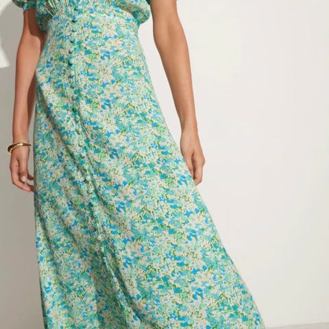 Faithfull the Brand Kjole til spesiell anledning i størrelse L, i nydelig dus gulfarge. Off shoulder med topp i lin. Ikke brukt da den ble for stor.
