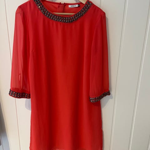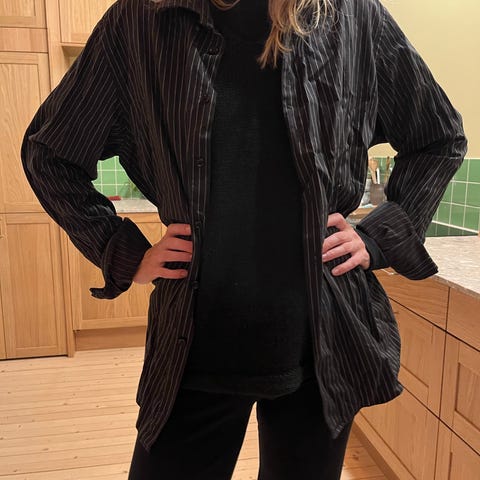Det står ikke størrelse, men den er ganske fleksibel pga kreppene. Kjøpt på bruktbutikk i Berlin. Mulig å kneppe igjen ermet nederst, men jeg glemte å vise dette på bildet. Om en ikke ønsker sleng på ermet.