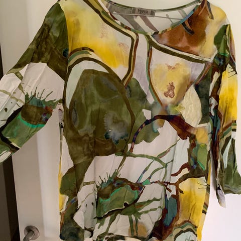 Helt ny, kun prøvd, men denne ble for tettsittende for meg. Vanskelig å ta et fint bilde, da stoffet"lever" litt. Det første bildet viser eksakt hvordan toppen er. Fargen er: offwhite. Normal på str.