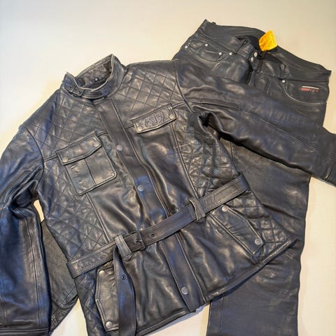 Skinnbukse med seler i svart farge, størrelse 44. Laget i skinnmateriale, designet for voksen. Motorsykkelbukse