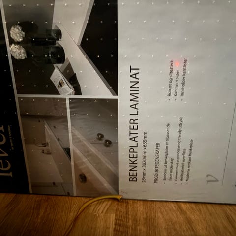 benkeplate i mørkt trefiner. Benkeplaten har en flat overflate med synlig trestruktur, egnet for bruk på kjøkken eller arbeidsområder. Materialet er trefiner som gir et naturlig utseende. 200kr