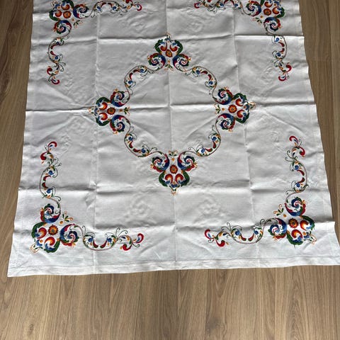 Har en fin duk for salg. Den er naturhvit med beige vevd mønster.