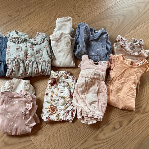 Søte kjoler og ein romper til baby i størrelse 56. Strømpebukser i størrelse 50/56.