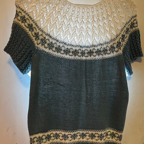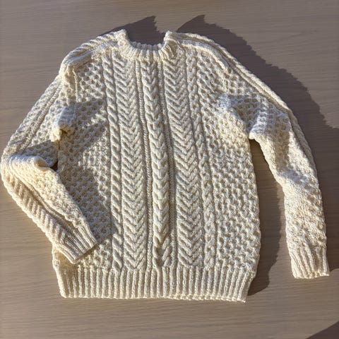 Høyhalset genser i 80% polyester og 20%ull, størrelse S, farge hvit. Genseren har et kabelstrikket mønster og kan hentes på Skøyen eller Asker togstasjon. Kan sendes mot frakt.