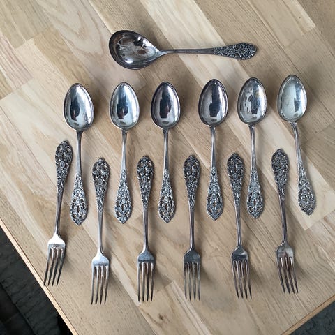 Selger 4 skjeer og 4 gafler av bestikk 'Spesial'. Ikke slitt. 40 grams. 80 kr pr del, eller 500 kr for hele settet.
