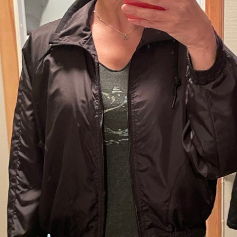 Tynn boblejakke/bomberjacket med glansede striper. Jeg vet ikke om den kan kalles en boblejakke, men jeg har brukt den høst, vinter og vår.