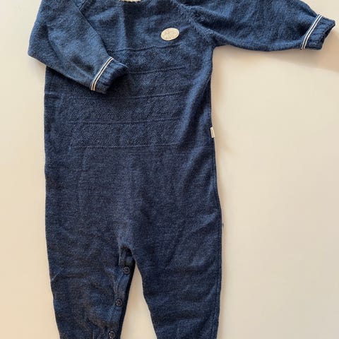 Lillelam barneklær i størrelse 80, unisex, laget av grønn merinoull. Settet inkluderer heldress, lue og sokker med detaljer i mønster. Materialet gir varme og komfort for barn. Svært lite og pent brukt. Tøflene er noe mer brukt enn dress og lue som kun er brukt noen få ganger.