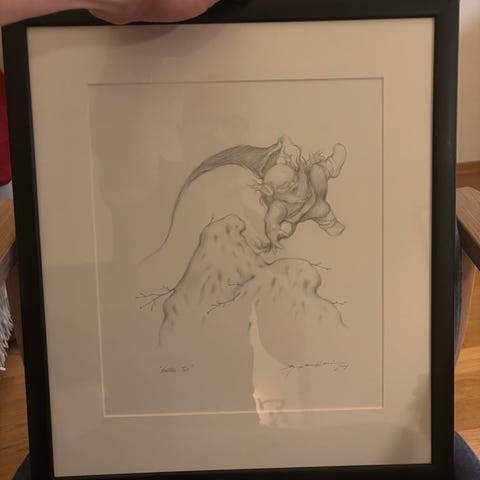 Selger unna litt arvegods. Orginal tegning av Bjørn Båsen, Elvetuss i fra 2004. Ikke prutbar.