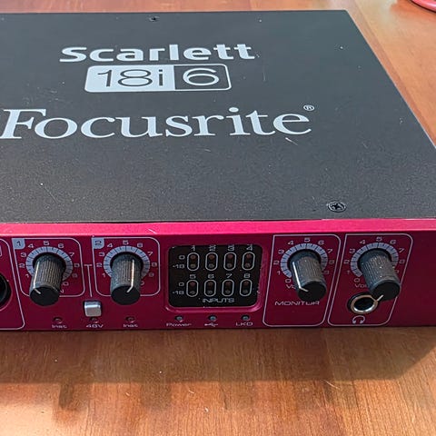 Selger min Focusrite Scarlett 18i8 Lydkort. Kjøpt under Covid og brukt 1 gang. Plastikkbeskytter på sidene er enda på.
