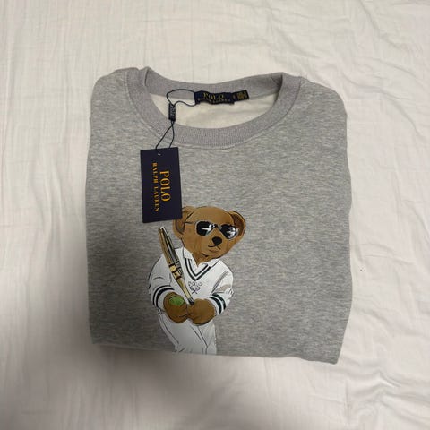 Ralph Lauren Polo Bear genser i størrelse S for herre. Genseren er grå og laget av bomull. Den har et motiv av Polo Bear på forsiden. Super kul. Selges billig