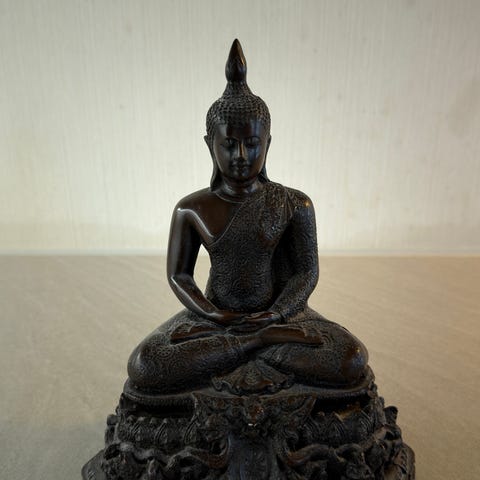 Buddha statue med rød og svart farge, dekorativt objekt som kan brukes til innendørs dekorasjon.