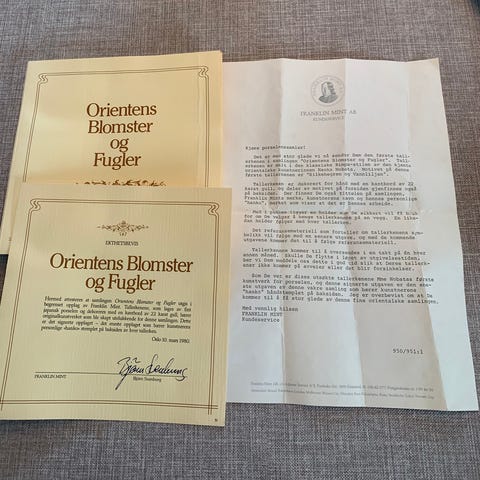 Dekorativ tallerken med et asiatisk motiv som viser en blomstrende grein og et byggverk i bakgrunnen. Tallerkenen har en rødlig oransje farge med detaljer i hvitt og gull. Passer til dekorasjon eller samling.