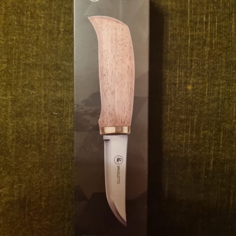 Ubrukt Brusletto kniv av modellen Hovet til salgs. Dette er en allroundkniv med totallengde på 23,2 cm og bladlengde på 11,6 cm. Det medfølger brun slire I okselær.