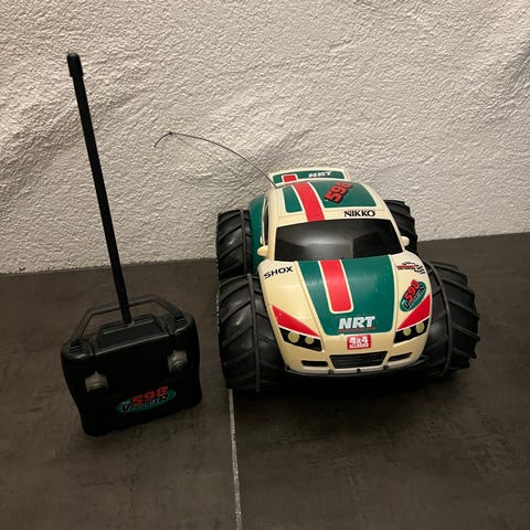 Radiostyrt bil i hvit og grønn farge med store, brede hjul. Bilen har en kompakt design og antenne for fjernstyring. Egnet for bruk på ulike underlag på grunn av de store hjulene. Har kjørt den for det meste ute, brukt på grus.
