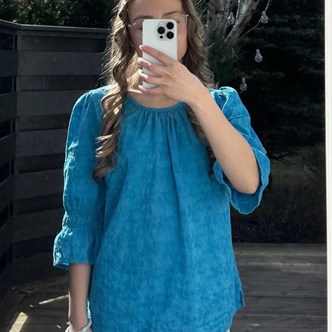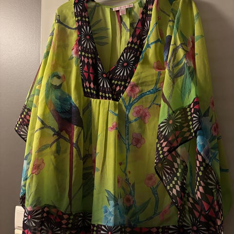 Karen by Simonsen bluse i størrelse 34 for kvinner. Blusen er grønn og laget av bomull. Den har dekorative små broderte blomster og en v-hals med knyting. Blusen har lange ermer med mansjetter og en rysjekant rundt halsen.