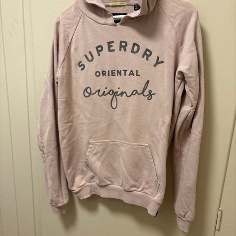 Superdry Heritage hettegenser i størrelse S for kvinner, laget av akryl. Genseren har hette og er gul i fargen. Den har en frontlomme og dekorativ logo på brystet.