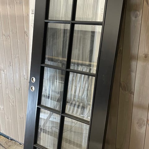 Medfølger DEKO Atelier Lasekasse og dørbredder samt dørkarm i farge svart. NB: toppsville i karmsettwt er noen cm for kort - tilpasning må påberegnes. Døren vil kunne skape «de lille ekstra» i riktige omgivelser. Passet dessverre ikke inn hos oss da døren slår feil vei ift. våre behov. Mål som vist på bildet.