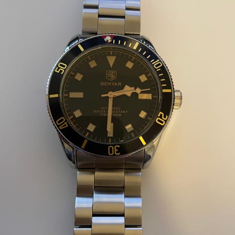 Flott Benyar Automatic selges. Dette er en homage til Tudor sin Black Bay serie. Få riper men det er noen få på lenken. ingen synlige på glasset. Denne er brukt kun en håndfull ganger. Selges med ekstra lenker og boks. Kan sendes med fiks ferdig